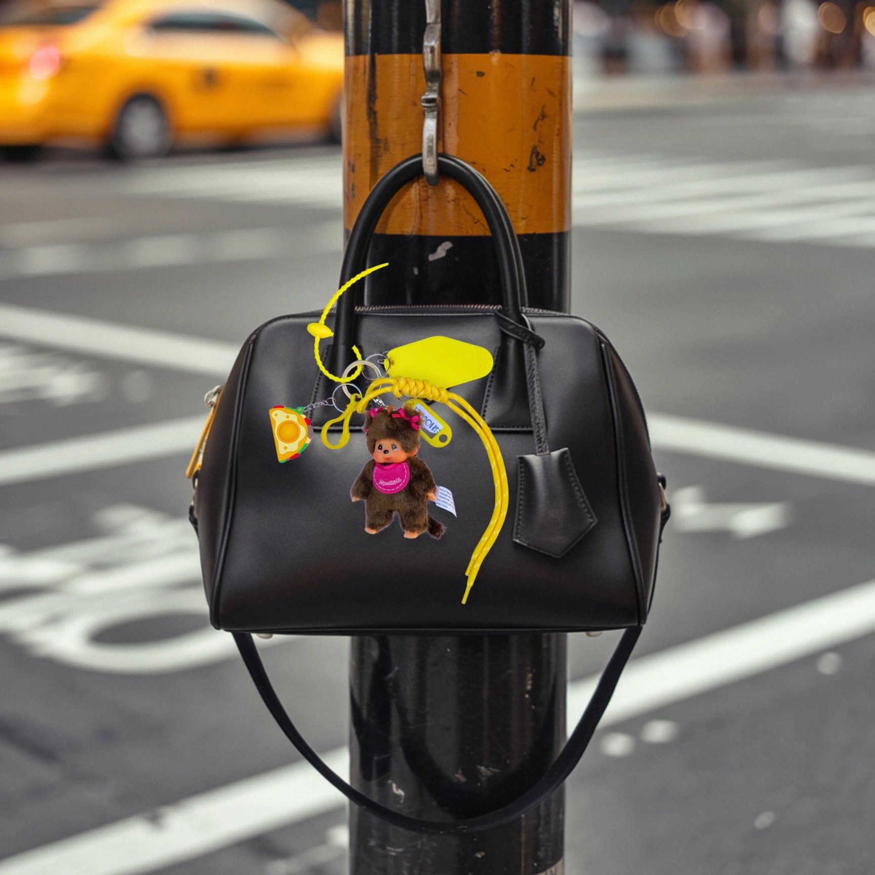 A nostalgic bag charm featuring a kiki, all in sunny yellow. A bold and fun accessory to add a retro wink to your style.