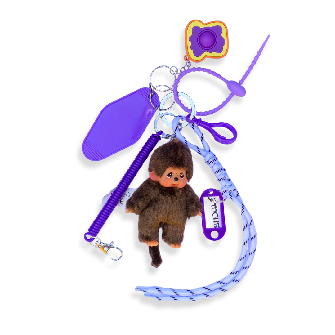 A nostalgic bag charm featuring a kiki, all purple. A bold and fun accessory to add a retro wink to your style.