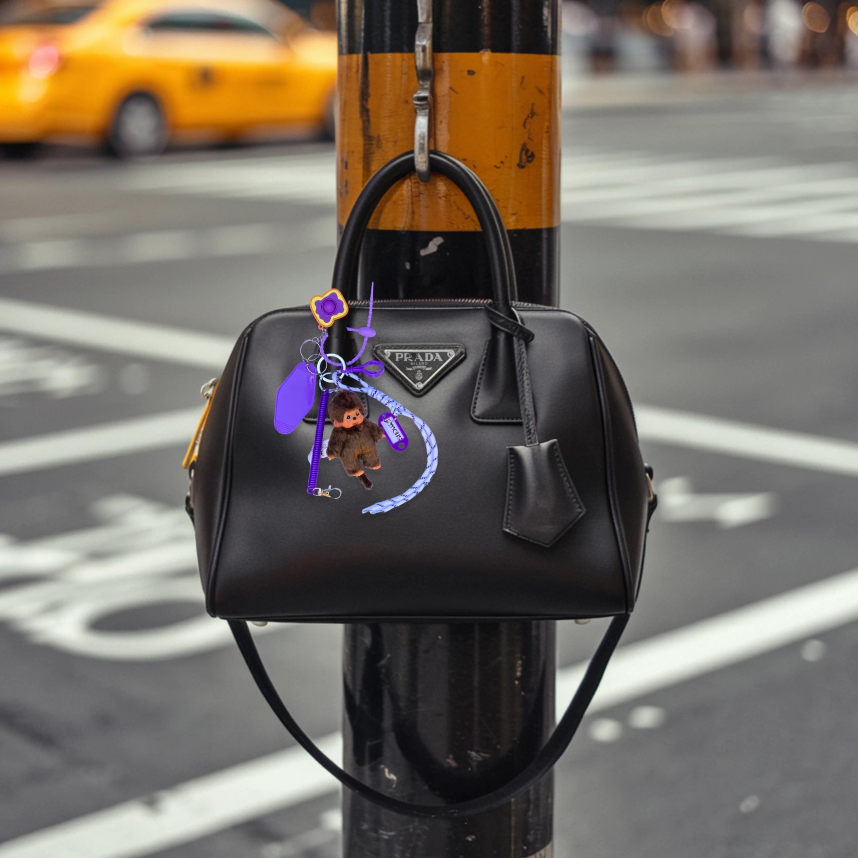 Un bag charm nostalgique avec un kiki et ses access full violet. Un accessoire plein de caractère et de fun pour ajouter un clin d'œil rétro à votre style.