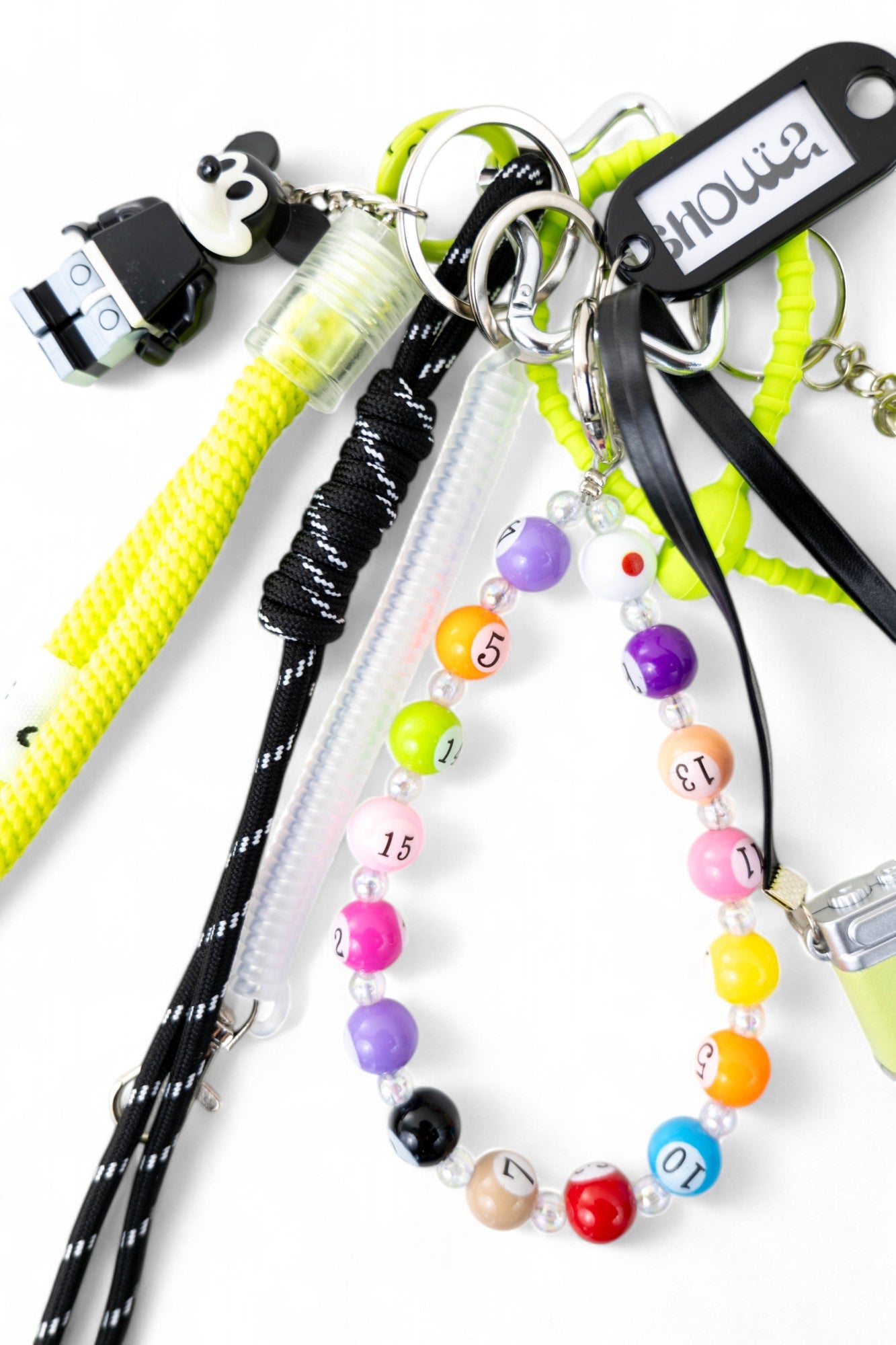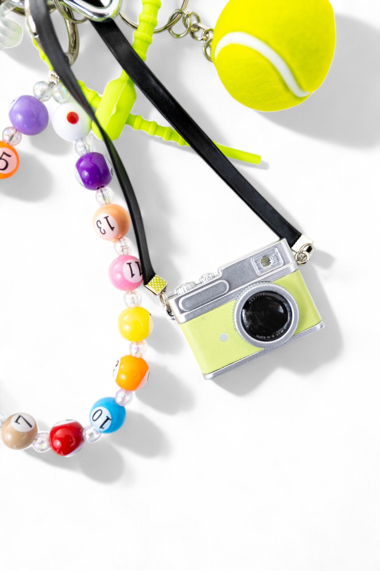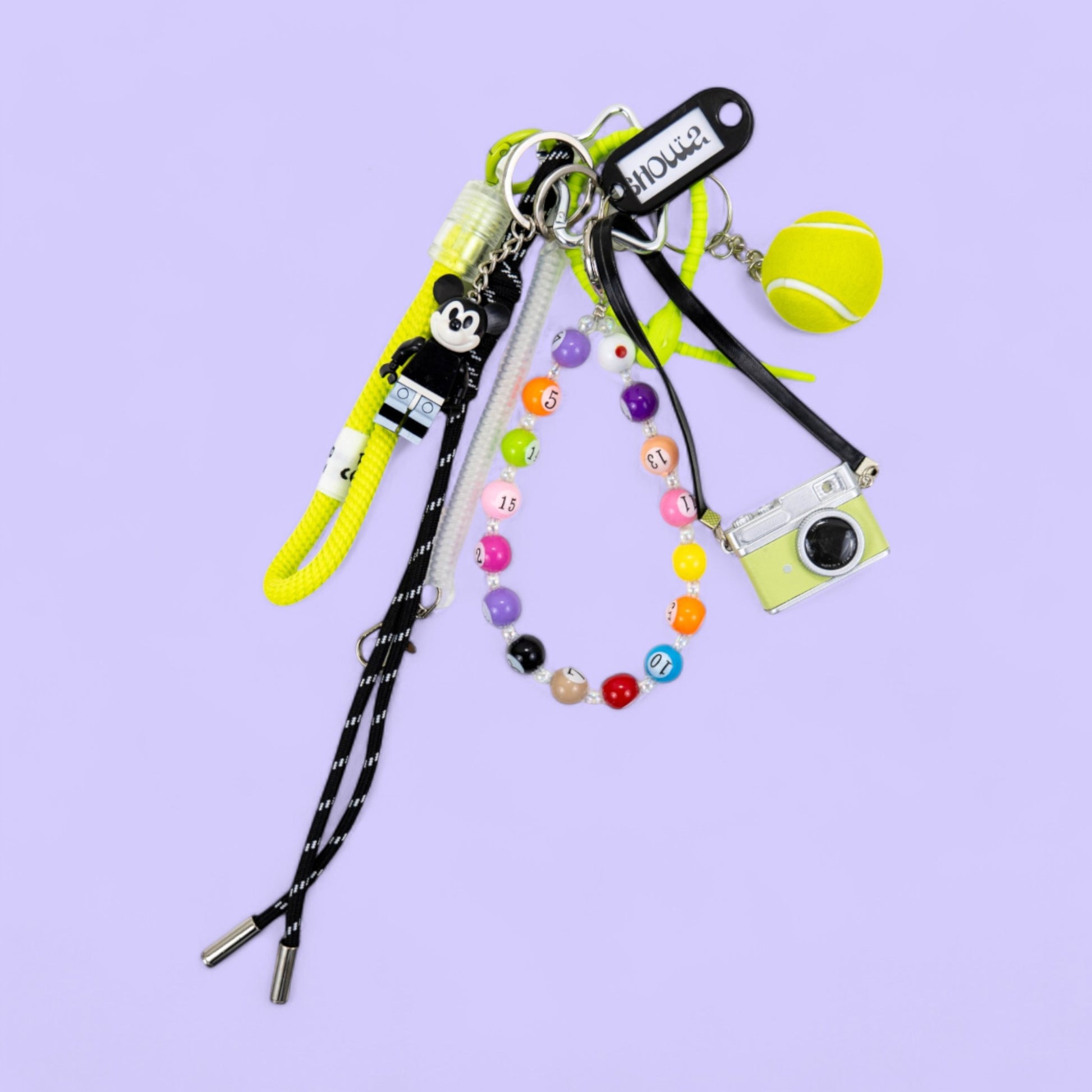 This bag charm features fun elements like a tennis ball, billiard bubbles, a camera, and Mickey Mouse. Perfect for retro-style lovers, with yellow and black cords to complete the look. Gadget delivered with batteries.