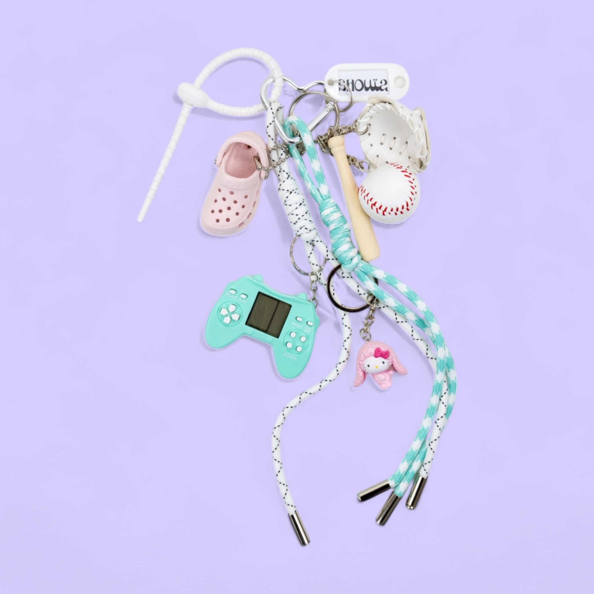 A gamer at heart? This bag charm pairs a retro game controller, a Crocs slipper keychain, and a baseball bat, all tied to baby blue and white cords. Perfect for a geek-chic style. Gadget delivered with batteries.