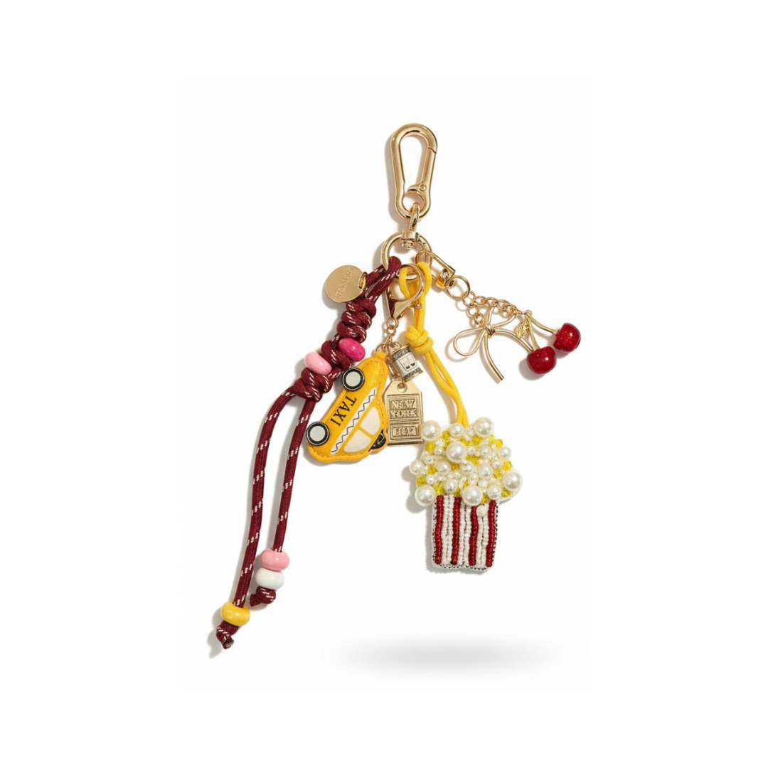 A bag charm inspired by NYC energy, featuring iconic elements: popcorn, yellow taxi, cherry, and dollar charms, finished with a bold red and yellow cord.