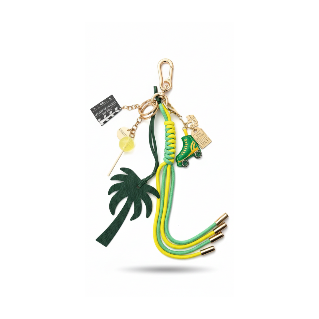 A bag charm inspired by Los Angeles & Hollywood, featuring iconic elements: roller skates, lollipop, palm tree, and a movie clapboard, finished with a green and yellow cord.