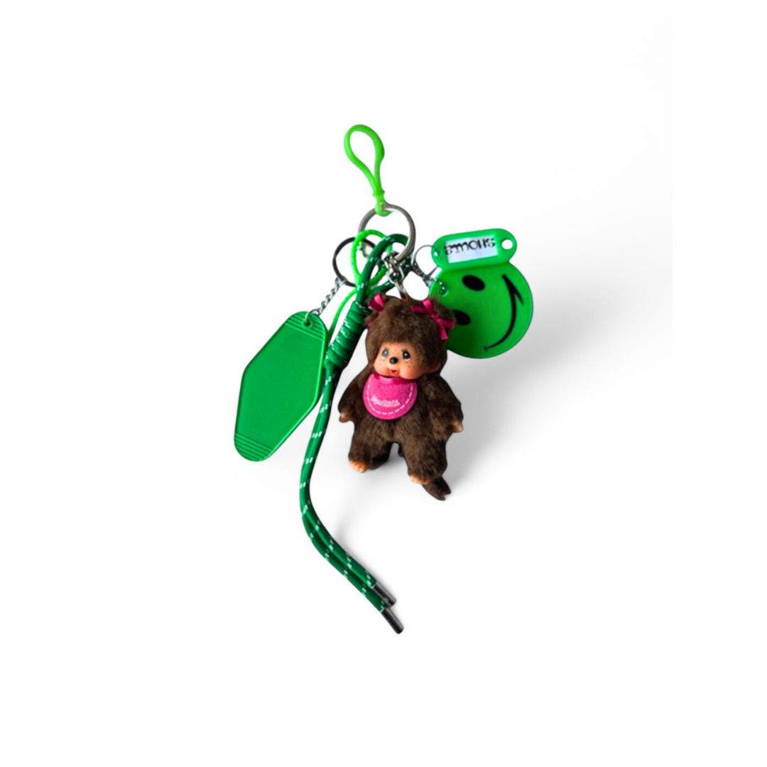 A nostalgic bag charm featuring a kiki, a smiley face, and a motel keychain, all in vibrant green. The ideal accessory to add a retro and fun touch to your bag.