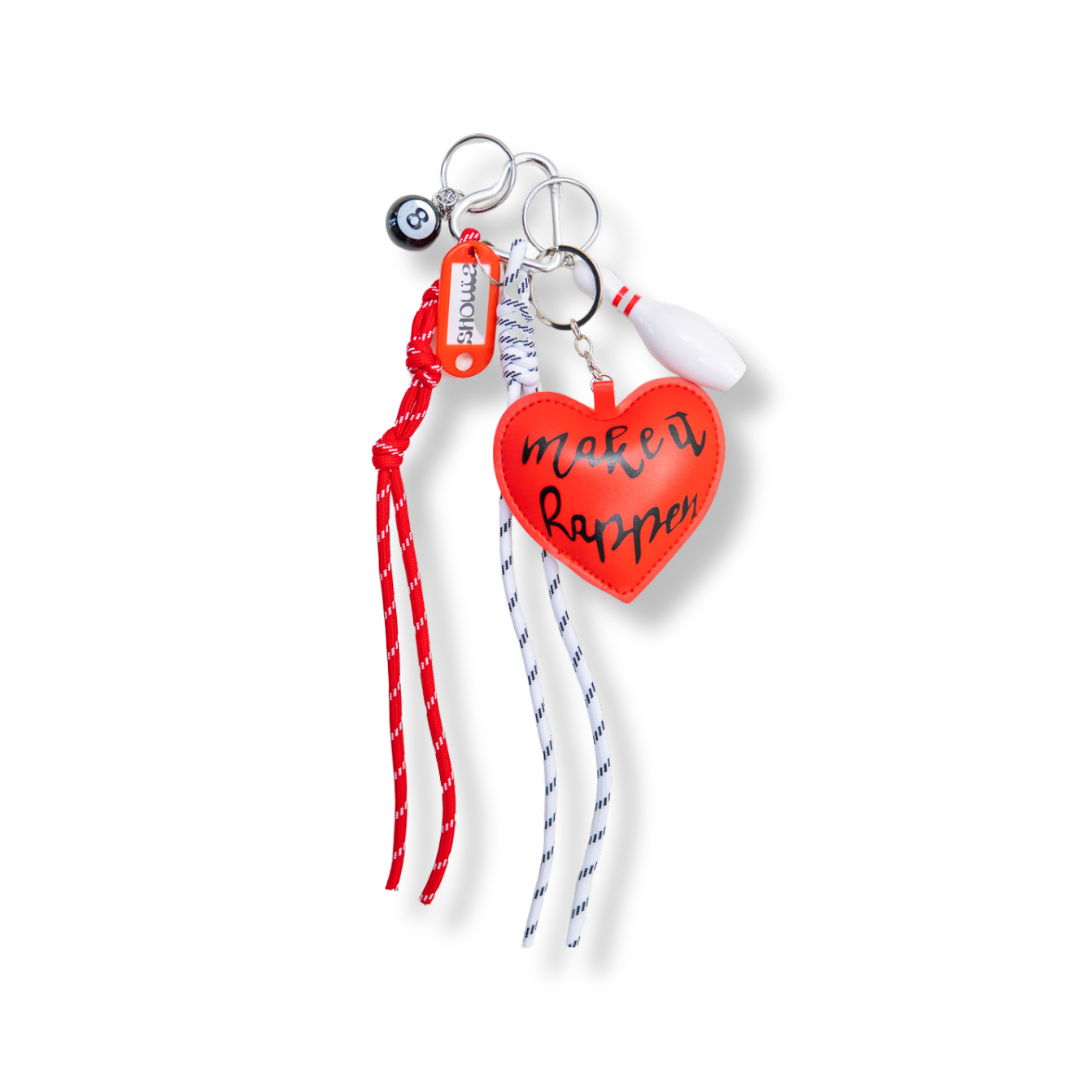 A unique bag charm blending love and fun! A vegan leather heart paired with bowling charms, a nod to an unforgettable NYC night.