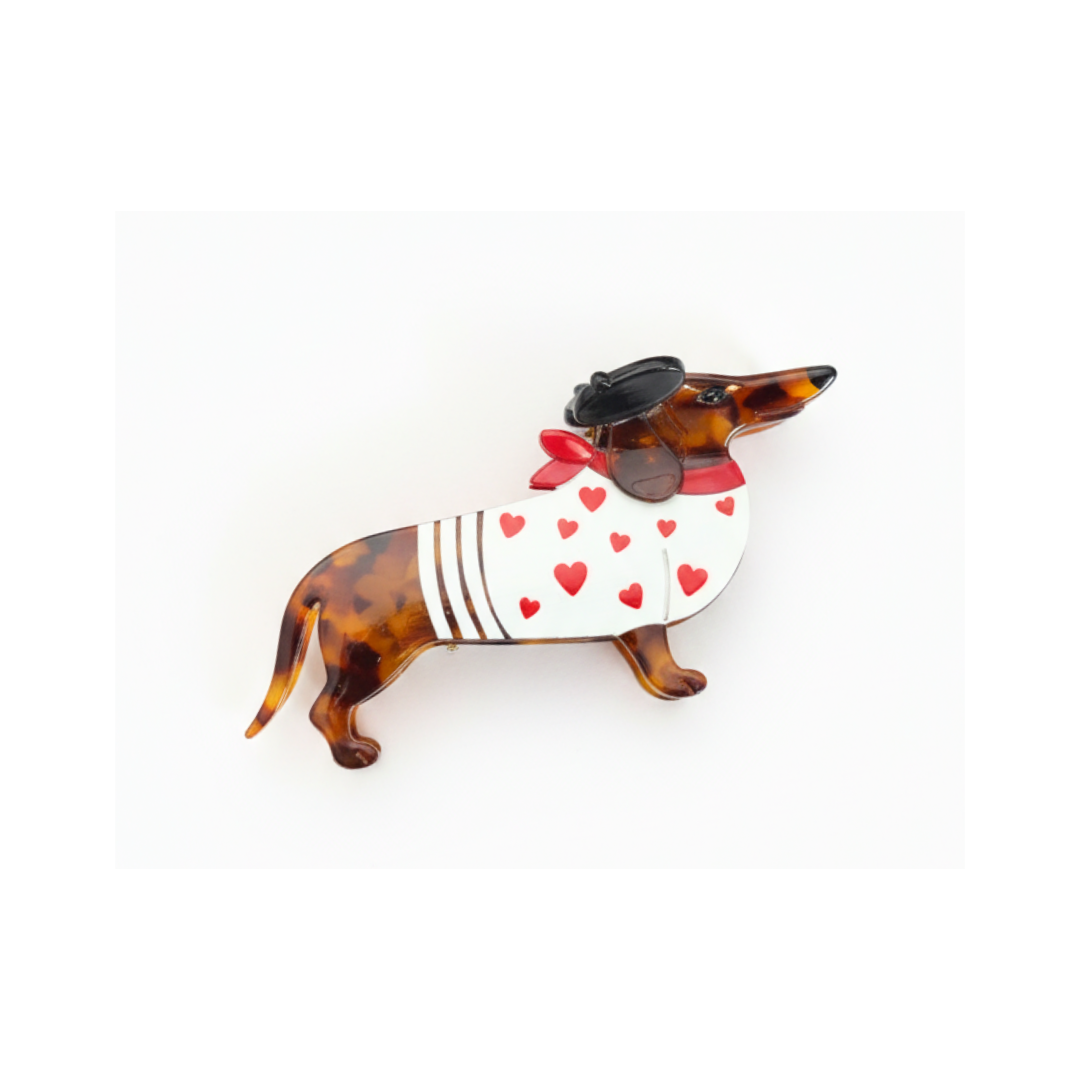 Une pince à cheveux en forme de petit teckel, habillé d’un motif cœurs rouges et blancs, réalisée en 100% acétate, aussi tendance que pratique.