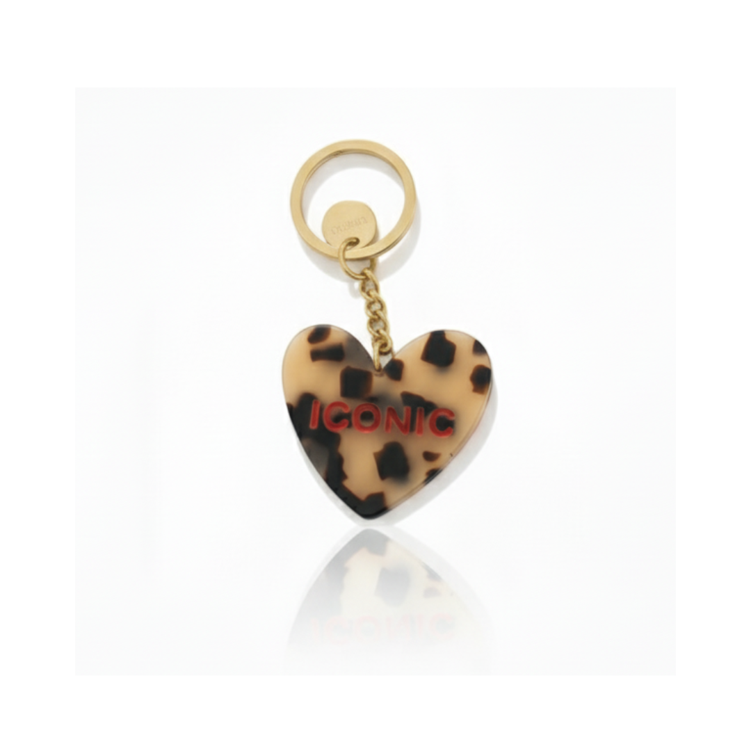 A leopard-print heart-shaped keychain made from acetate, featuring the word “ICONIC.”